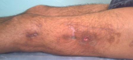 Из анамнеза: Больной травму получил в г Орехово-Зуево, Московской обл., в результате ДТП. Лечился около двух месяцев в отд. травматологии гор. больницы г.Орехово-Зуево, с д-нозом (со слов б-ного) " Сочетанная травма. Открытый оскольчатый перелом с/з лев.бедренной кости со смещением к/о. Мн. перелом ребер с повреждением плевры и легкого.ЧМТ.". Со слов, осколок кости торчал в ране, ПХО раны , торакоцентез и реанимационные мероприятия, скелетное вытяжение. Через неделю началось высокая температура, гнойный плеврит, рана на бедре нагноилась и сепсис. Лечился долго, температура снизилось до 37,5, но до нормы не опускалась. Неоднократно готовили к операции, но из-за температуры не решились, наложена гипсовая повязка и по просьбе б-го выписан. Пока приехал к нам прошло еще около 20 дней. ВСЕ ЭТО ОСЛОЖНЕНИЕ И НАГНОЕНИЕ РАН БОЛЬНОЙ РАССКАЗЫВАЕТ ТОЛЬКО ТЕПЕРЬ!