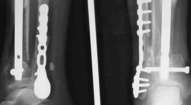 А я бы хотел еще раз подчеркнуть ключевую роль вмешательства на малоберцовой кости в подобной ситуации. В приведенном примере при открытом переломе произошла потеря большого фрагмента большеберцовой кости. Фиксация интрамедуллярным гвоздем с одним блокирующим винтом проксимально и одним дистально. Плюс стабильный остеосинтез малоберцовой. Консолидация за три месяца без костной пластики в условиях ранней нагрузки.