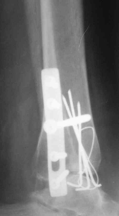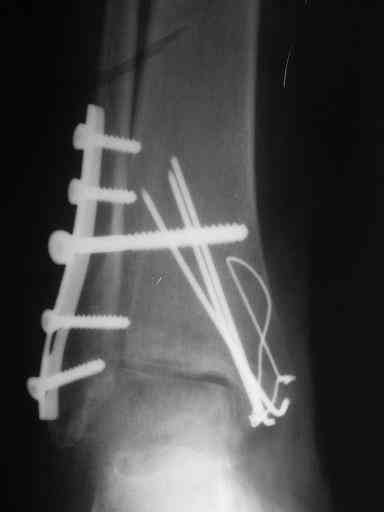 Завершая презентацию случая хотим показать результат операции. Прооперировали больную в соседнем отделении. На операции выраженый рубцовый процес в области синдесмоза, остеопоротические изменения в области медиальной и латеральной лодыжек. Провели удаление рубцовой ткани, остеосинтез медиальной и латеральной лодыжек с позиционным винтом на синдесмоз.Фото прилагаем. Благодарим за отзывы.