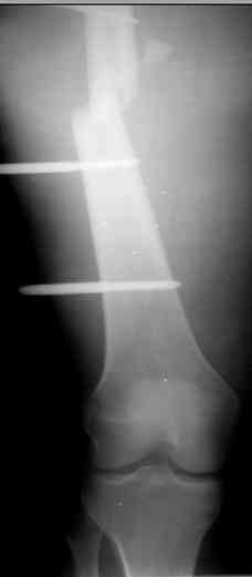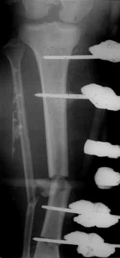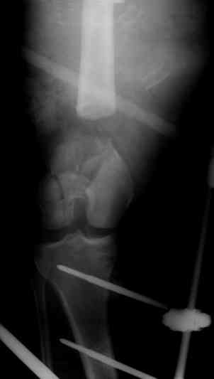 При поступлении Hb 66 ISS 40, фиксация стержневыми аппратами, сосудистые хирурги выполнили шов вены. Выполена резекция бедренной кости 9 см