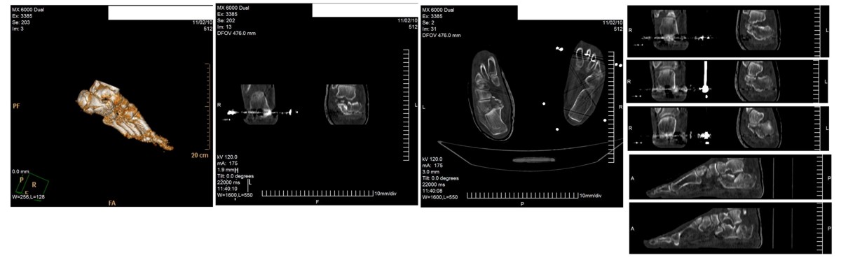 Уважаемые коллеги!Мужчина, 47 лет. Диагноз: Кататравма (26.10.10г. падение с высоты 2го этажа). Открытый оскольчатый внутрисуставной перелом дистального метаэпифиза лучевой кости, перелом шиловидного отростка локтевой кости левого предплечья со смещением отломков, закрытый оскольчатый внутрисуставной перелом дистального метаэпифиза лучевой кости, перелом шиловидного отростка локтевой кости правого предплечья со смещением отломков. Закрытый оскольчатый внутрисуставной перелом левой пяточной кости, закрытый оскольчатый внутрисуставной перелом дистального метаэпифиза обеих костей правой голени со смещением отломков, закрытый компрессионно-оскольчатый перелом тела L2 позвонка с болевым вертеброгенным синдромом. Голень и предплечья синтезированы АВФ в ургентном порядке. В настоящее время состояние пациента стабильное, к оперативному лечению соматически готов. Во время клинического разбора мнения разделились: 1) открытая репозиция, МОС пяточной пластиной 2) гипсовая иммобилизация 3) ЧКО аппаратом внешней фиксации как репозиционный и окончательный вариант остеосинтеза. 4) необходимость СКТ? Коллеги, пожалуйста, интересует ваше мнение относительно тактики лечения, необходимого перечня рентгенологического обследования оскольчатого внутрисуставного перелома пяточной кости и сроков выполнения предполагаемой операции. Просим высказаться относительно необходимости выполнения СКТ как важного этапа диагностики. Пациент будет повторно представлен на ближайшем клиническом разборе (приветствуются примеры аналогичных клинических случаев, ссылки на современную литературу и диссертационные работы).Заранее благодарим!С уважением,А.В.ВладзимирскийДНИИТО