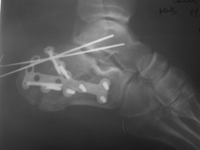 Операция проведена на 14е сутки после травмы. Фиксация блокируемой пластиной. Трудности - сложность репозиции; необходимость костной пластики (уложен измельченный трансплантат из гребня подвздошной кости 4,5х1,5х1см); множество мелких отломков; большой фрагмент наружной кортикальной пластинки, закрывающий картину в суставе.