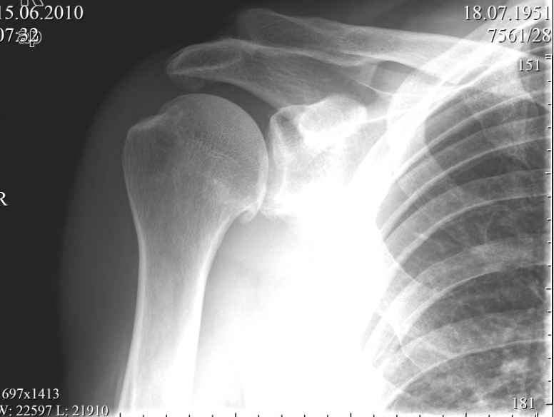 увидел пациента, он щадил руку, было ограничение объема движений в правом плечевом суставе.
