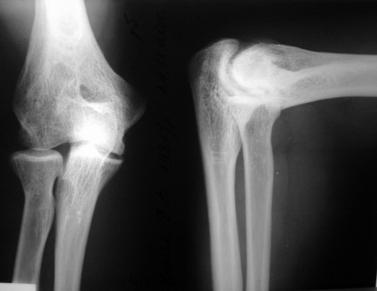 Мужчина, 29 лет. В 15 лет - спортивная травма, закрытый чрезмыщелковый перелом правой плечевой кости со смещением. Лечился консервативно. В настоящее время предъявляет жалобы на ограничение сгибания, повышенную утомляемость.