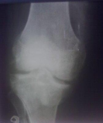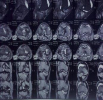 и крестообразных связок определить не удается из-за боли и контрактуры.