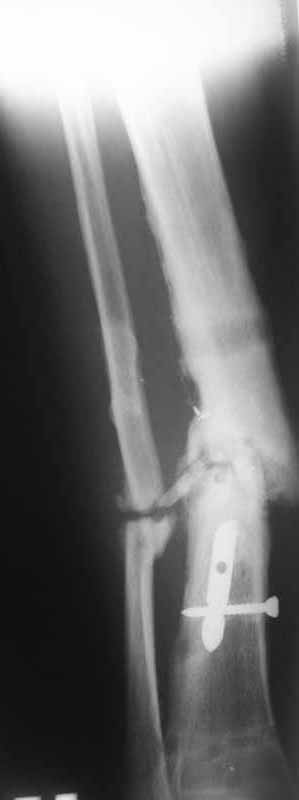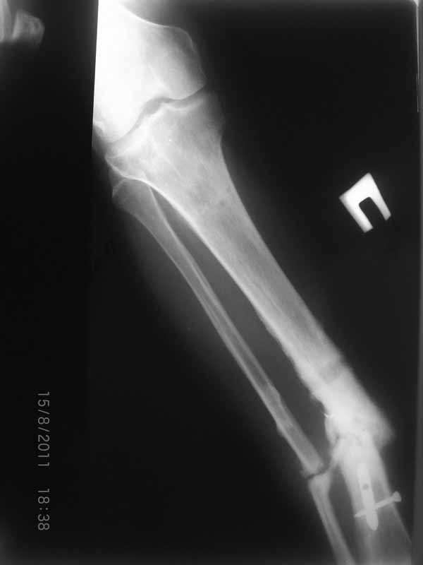 Первично у пациента травма в марте 2009г, когда в результате ДТП получил открытый оскольчатый перелом обеих костей правой голени на границе средней и нижней трети. При поступлении - скелетное вытяжение, затем по заживлению раны произведен остеосинтез пластиной. Со временем (точное время сказать затрудняется) пациенту разрешили полную нагрузку на конечность. Через год после операции пластина сломалась, в связи с чем пластина удалена и установлен интрамедуллярный гвоздь. Через 2 месяца разрешили полную нагрузку и гвоздь сломался. В сентябре 2010 произведено наложение спицевого компрессионно-дистракционного аппарата. В мае 2011 появилось отделяемое в местах проведения спиц, в связи с чем аппарат демонтирован. Правая голень временно иммобилизирована гипсовой повязкой, разрешена нагрузка на правую нижнюю конечность. После снятия повязки - клиника ложного сустава обеих костей правой голени. В настоящее время отмечается угловая деформация правой голени на границе средней и нижней трети с отклонением оси в медиальную сторону. Кожные покровы изменены за счет трофических нарушений(имеют более темную окраску по сравнению со здоровой ногой)На коже рубцы на месте проведения спиц.Движения в коленном и голеностопном суставах в полном объеме безболезненны. Пульсация артерий на стопе отчетливая, выпадение чувствительности от третьего луча в латеральную сторону по тылу стопы. В таком виде пациент оказался у нас. Рады выслушать предложения о тактике лечения.