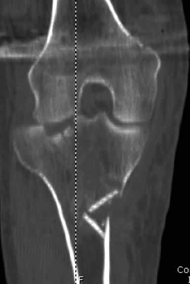 А в данном случае мыщелок сросся со смещением кпереди и ротирован. За счет интактной наружной колонны опороспособность конечности сохранена, но остается варус и экстензия конечности. Для предоперационного расчета необходимо сделать на всю длину конечности рентгенограмму, а в остром периоде КТ и 3-мерный снимок помогут лучше ориентироваться в характере перелома.