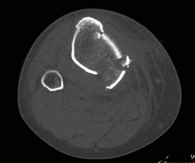 На снимке типичный перелом медиального тибиал плато с передним смещением (подвывих) по Schatzker IV. Консервативное лечение без медиальной опоры не может удержать деформирующие силы, и из-за вторичного смещения мыщелка конечность смещается в варус. Кроме передних смещений еще встречаются сложные фронтальные варианты переломов, и тогда голень подвывихивается кпереди.