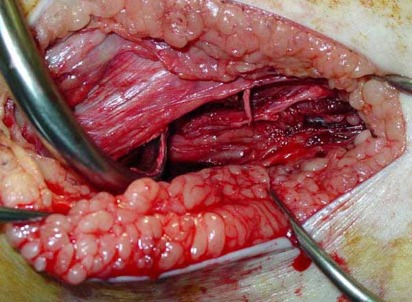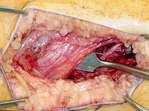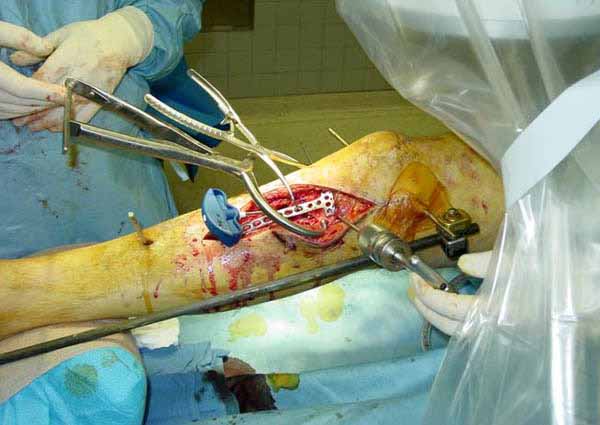 Остеотомия с разворотом медиального мыщелка, и для фиксации можно применить параллельные субхондральные межмыщелковые шурупы. Дополнительная медиальная Smith-Nephew PERI-LOC™ (Periarticular Locked Plating System) пластина. При отсутствии специальной пластины можно адаптировать Tomofix для высокой остеотомии. Доступ прямой медиальный через pes anserinus или через интервал pes с medial gastrocnemeus.