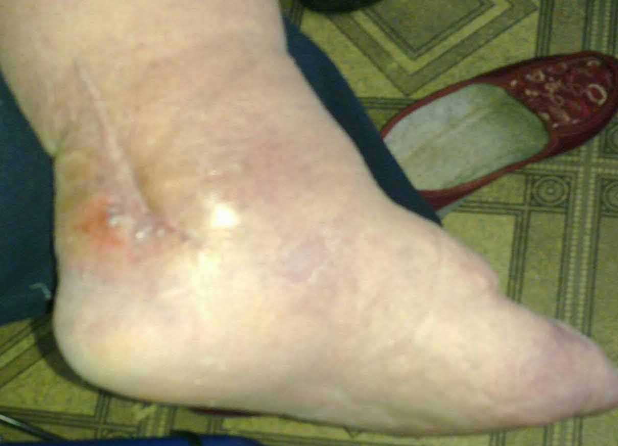 Женщина 78 лет. Полгода назад в сустав дважды вводили дипроспан с целью лечения артроза. Спустя некоторое время появился отек, боль и пр. Три месяца назад дугообразным разрезом вскрыли абсцесс по задне-внутренней поверхности голеностпоного сустава. Теперь там свищ со скудным гнойным отделяемым.