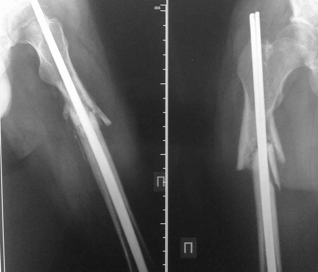 у пациента 24 лет после перелома бедра в ноябре 10г. и остеосинтеза двумя титановыми