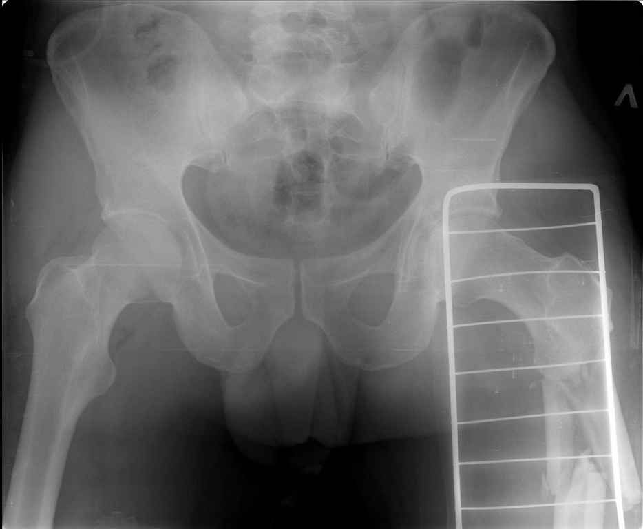 выявлено вторичное смещение дистального отломка. Левая нога по сравнению со здоровой