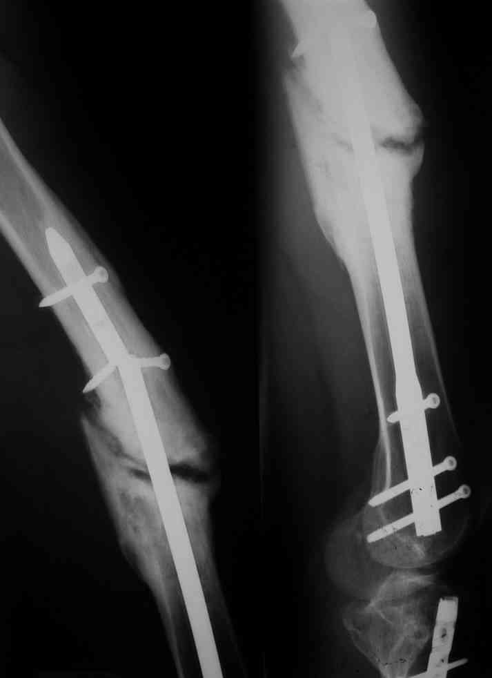 случай, который пришлось оперировать 3 мес. назад. Тоже короткий гвоздь. Шляпки винтов