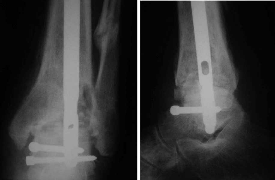 Интересный случай. Допускаю, что состояние мягких тканей приемлемое. Цель лечения должна заключаться, как мне кажется, в ликвидации ложного сустава и достижении артродеза голеностопного сустава. Впрочем, это две взаимосвязанные задачи. Мы бы оперировали следующим образом. Остеотомия малоберцовой кости на вершине деформации. Передне-медиальным доступом артротомия голеностопного сустава, резекция суставных поверхностей с отломков большеберцовой и таранной костей, удаление рубцов между отломками дистального эпиметафиза большеберцовой кости, антеградный стержень с дистальным блокированием в таранной кости, костная пластика дефекта спонгиозным костным трансплантатом из крыла (возможно сразу из двух) подвздошной кости. Банальные артродезы голеностопного сустава мы обычно выполняем антеградным блокированным стержнем (см. вложенный файл), что позволяет сохранить подтаранный сустав, и нагружать ногу сразу после операции.