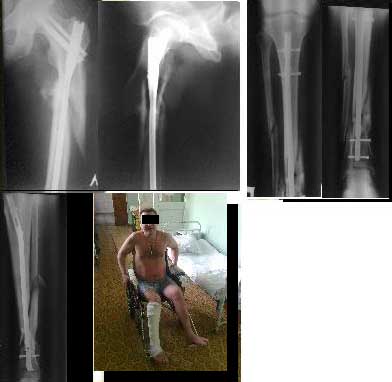 5.10.2011 синтез правой голени стержнем Деост, в закрытую с применением дистрактора и остеотомией малоберцовой кости. Снимкти в приложении. Пациент активизирован, начал передвигаться на коляске, сегодня встал с костылями.