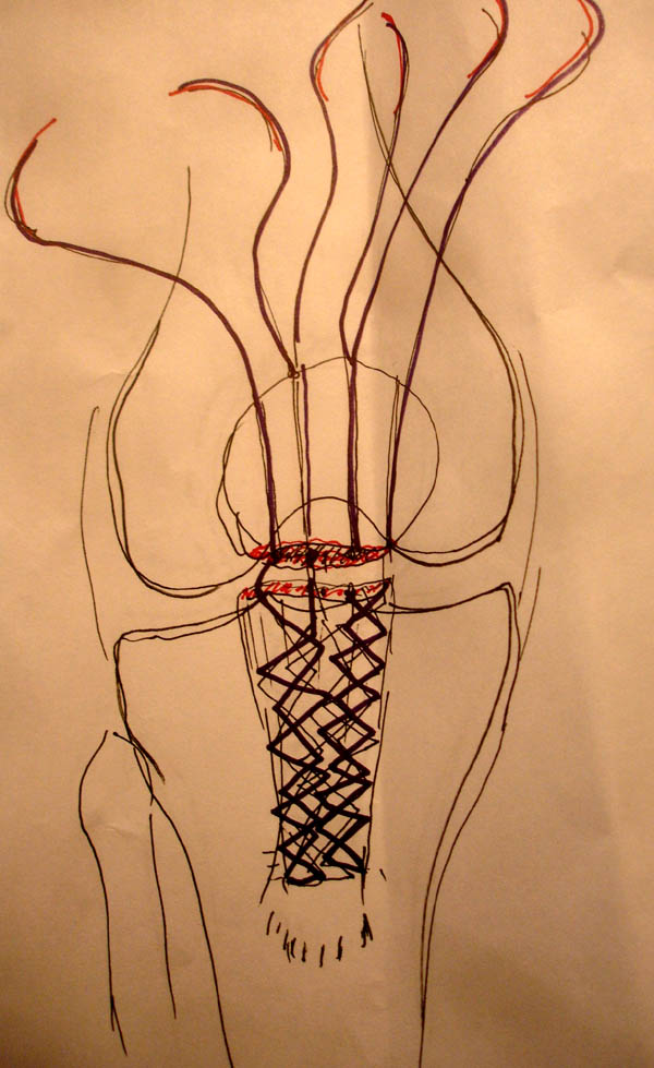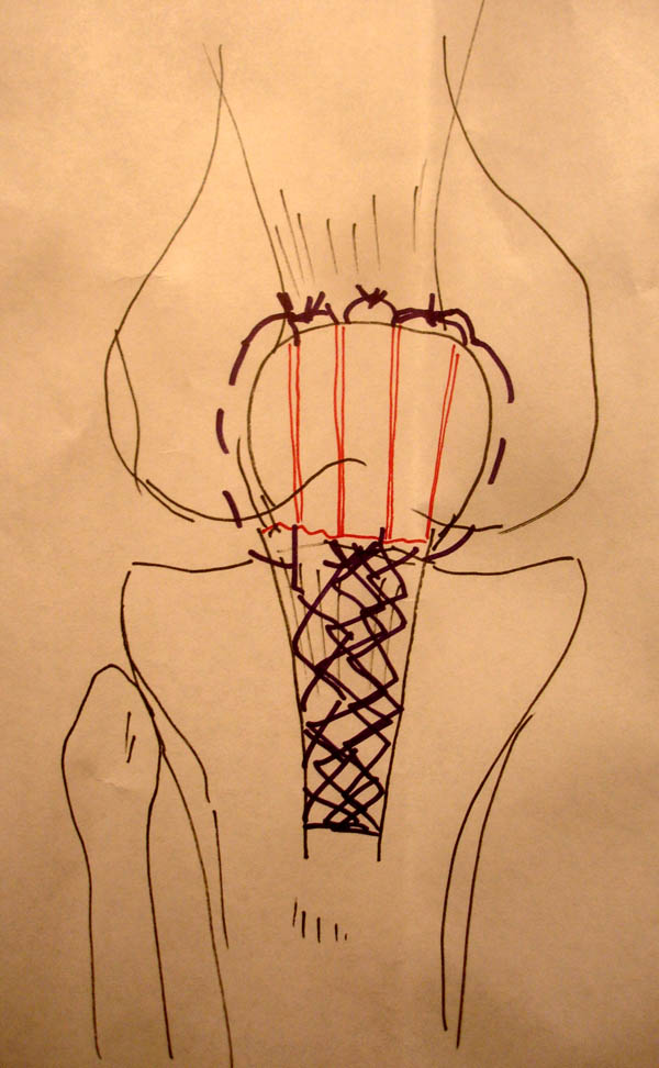 также надо провести через туннел в надколеннике. Я припоминаю, что выставлял