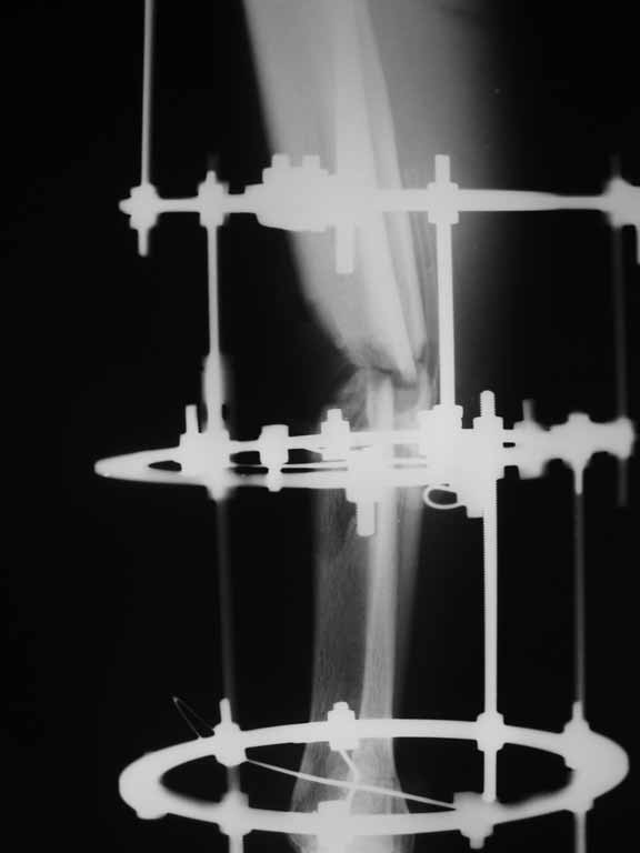 Ургентно произведена ПХО раны и ЧКО голени аппаратом внешней фиксации. В настоящее время
