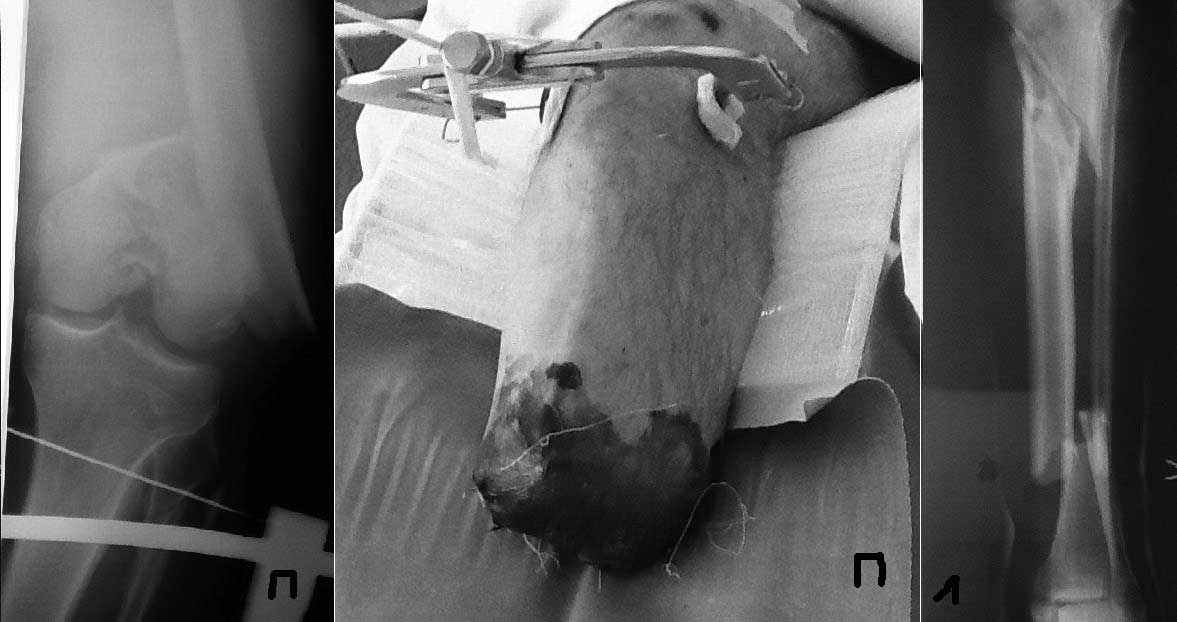 На данный момент некроз культи правой голени (см фото). Необходима реампутация. Наш план дальнейшего лечения: 1) ЗИО левой голени 2) антеградный остеосинтез правого бедра 3) Реампутация правой голени.