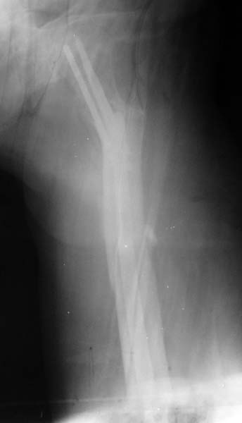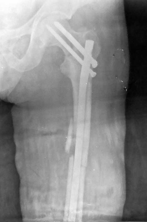 Форумом было рекомендовано пересинтезировать. Мы пригласили нашего дорогого друга Челнокова А.Н., основоположника БИОС в нашем регионе, который несмотря на очень занятость, и дальность расстояния решил выручать коллег, и приехал к нам. Уже прошло 2 мес. после первой операции. Винты из шейки удалены, наложен дистрактор, произведена закрытая репозиция шейки, стержень ChM удален, произведен остеосинтез стержнем DePuy, шейка фиксирована, кроме стандартных двух винтов, еще одним винтом спереди стержня. рентген снимки прилагаются.