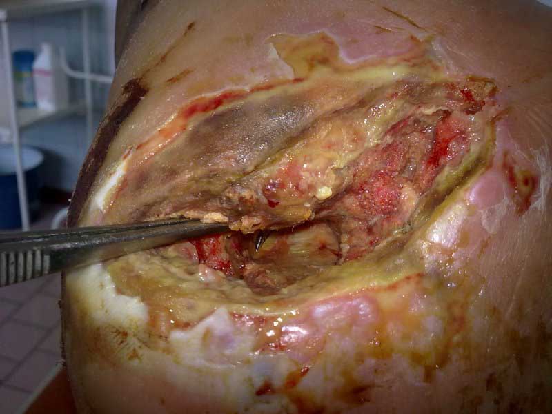 наладили постоянное вакуумирование с этапными некрэктомиями и перевязками каждые 48 ч. На