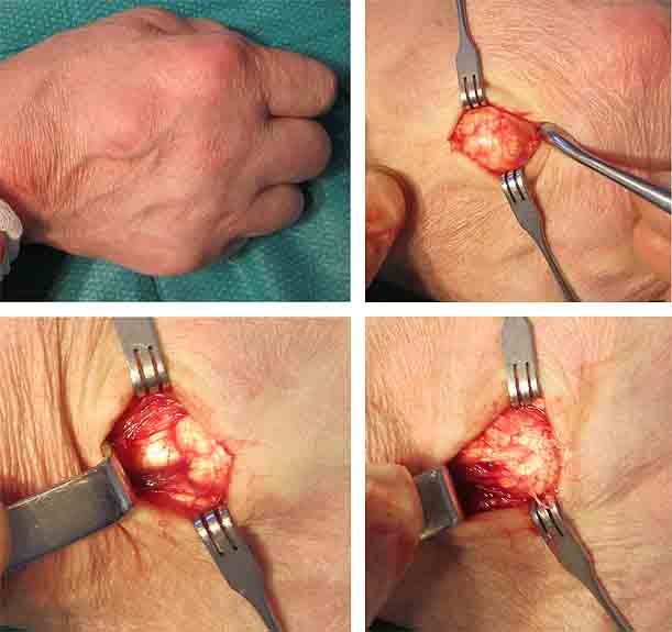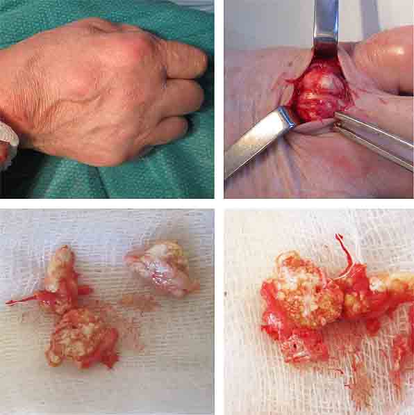 Уважаемый Алексей, уважаемые коллеги. Разрешите продемонстрировать интраоперационные фото удаления верифицированного тофуса при подагре. Вариант расположения относительно сухожилий № 1 -тофус расположен под сухожилием разгибателей.