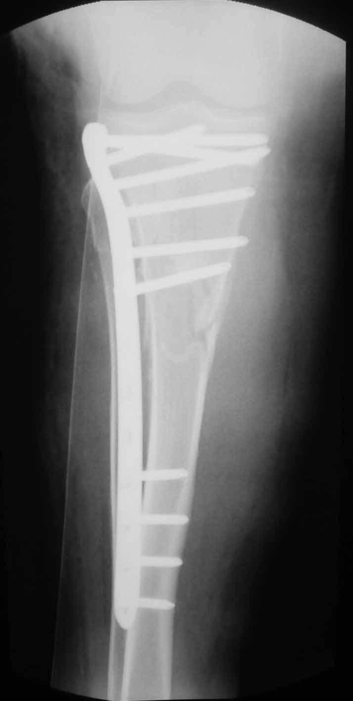 В нашей клинике 11.01 выполнен минимально инвазивный остеосинтез большеберцовой кости (снимки до операции не перефотографировал) с пластикой перемещенными лоскутами дефекта, образовавшегося вследствие некроза кожи на передней поверхности голени.