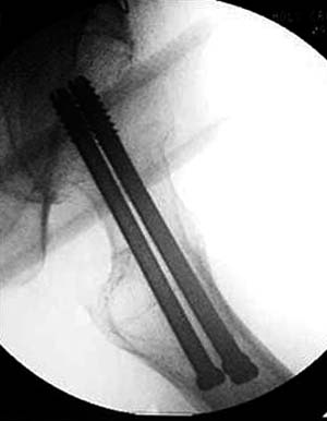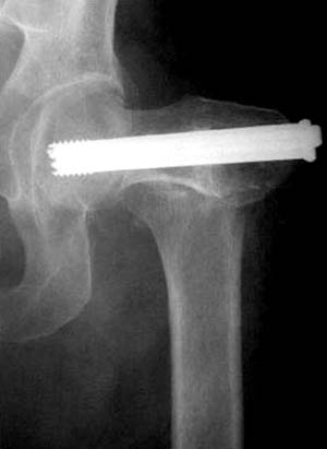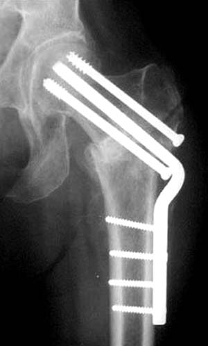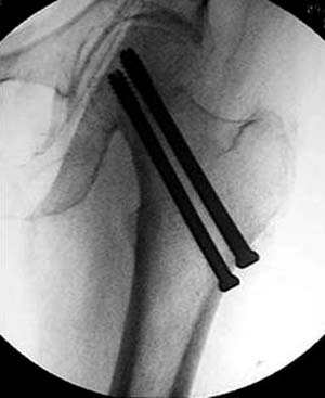Правильная техника фиксации - это три параллельных каннюлированных винта под углом 130 -135 градусов к диафизу, не ниже уровня малого вертеля. Проведенные ниже вертела винты с бОльшим углом (более вертикальные) в 20% осложнялись подвертельными переломами бедра. Ближе к кортикальному слою винты с длинным контактом резбовой части, а также каннюлирванные механически лучше, чем сплошные. Расположение винтово - в в виде V т.е. один внизу по калькару и два сверху-спереди и сзади.