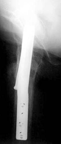 Для убедительности здесь пример подвертельного перелома после 3 недели, где латеральный кортекс ослаблен еще и из-за неоднократных попыток введения шурупов.