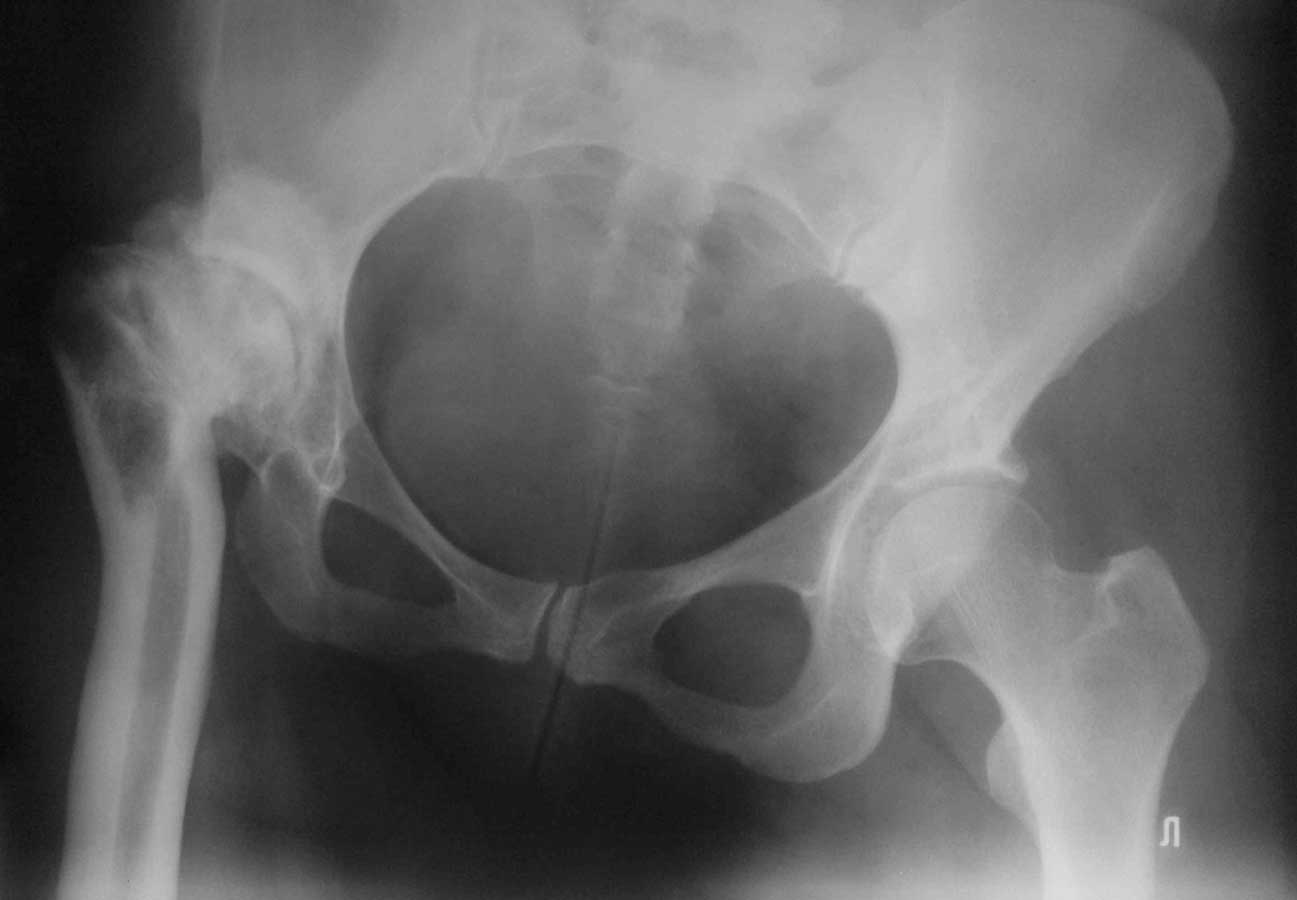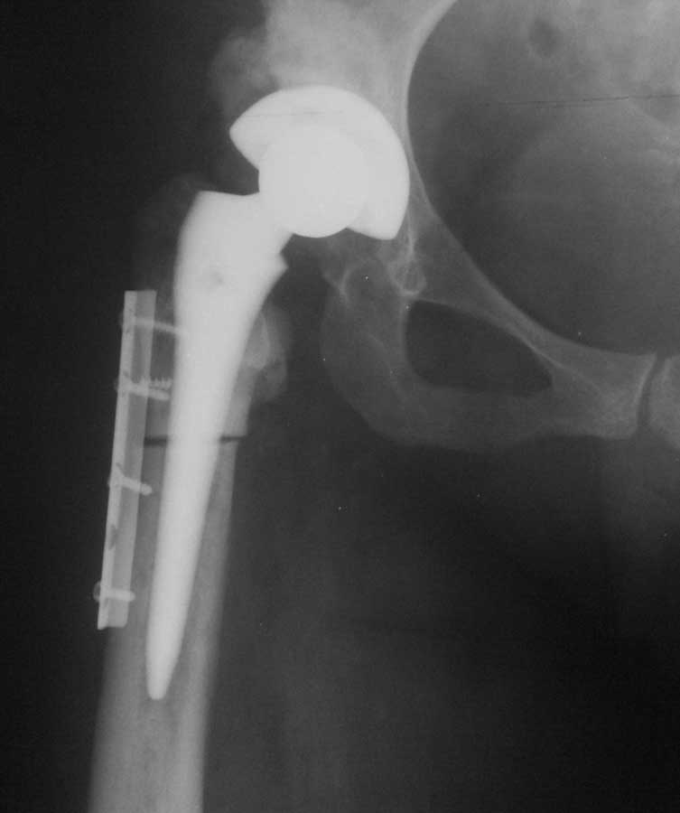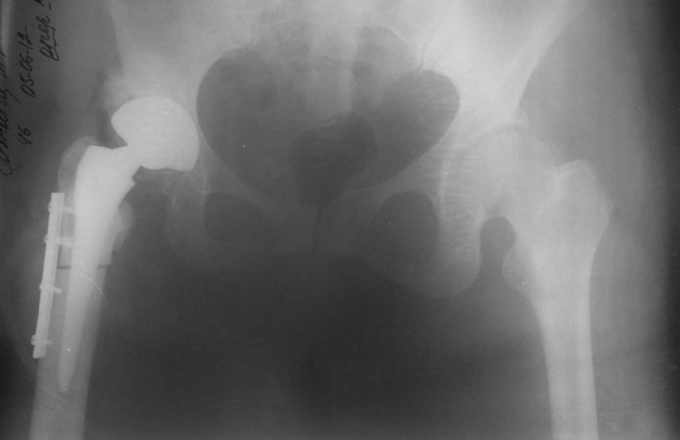 Операция около 1,5 месяцев назад: тотальное б/ц эндопротезирование с остеотомией проксимального отдела бедра. Послеоперационный период - без особенностей, рана зажила первично, выписана домой. В анамнезе в детском и юношеском возрасте несколько оперативных вмешательств на вертлужной впадине и бедре по поводу врожденного вывиха бедра, судя по рубцам, протекавшие не совсем гладко.
