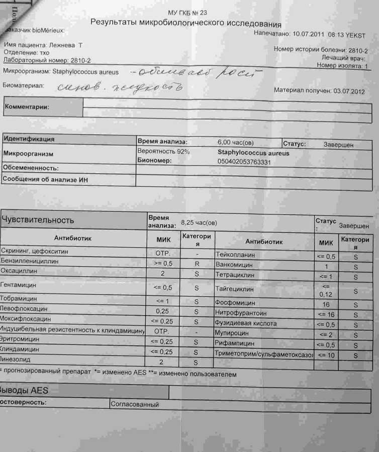 Пунктирован сустав - получен рост золотистого стафилококка. Учитывая острый тромбоз, назначена супрессивная а/б терапия с учетом чувствительности.