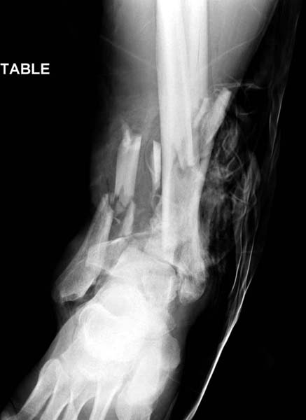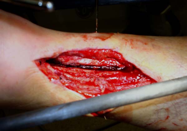 Через три дня повторная I&D, где через рану манипулировали дистальным фрагментом с установкой пары межфрагментарных шурупов. На рану вакуум и следующая обработка закончилась закрытием раны. Отек держался немного дольше, чем обычно.