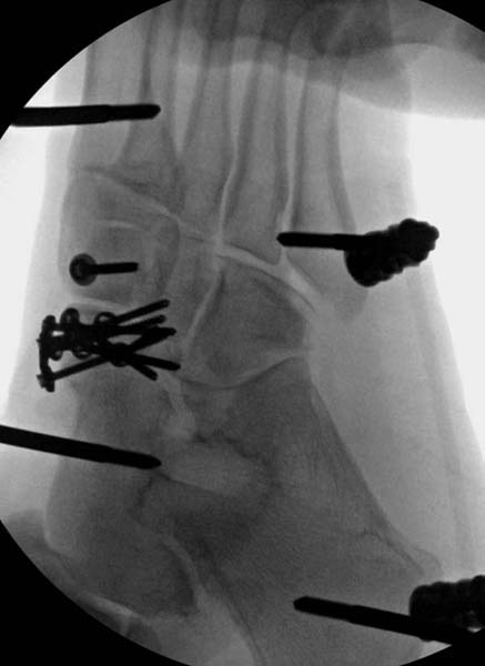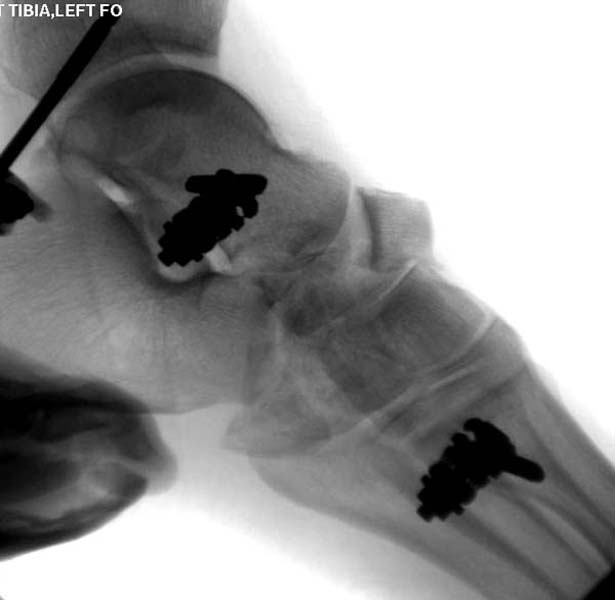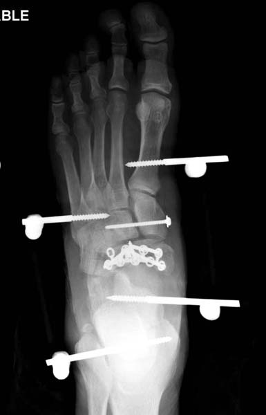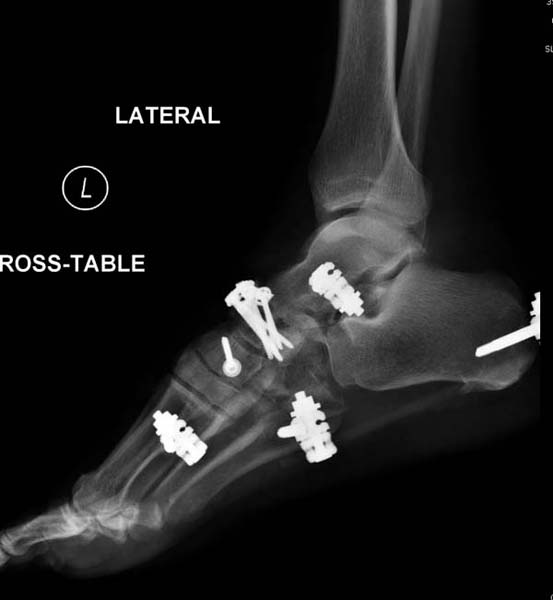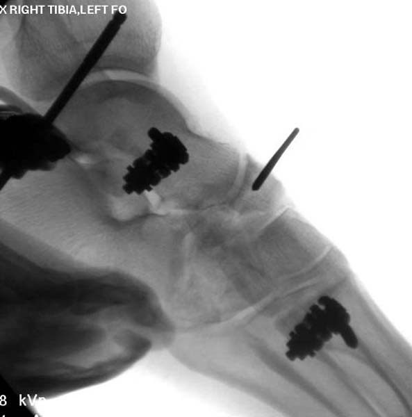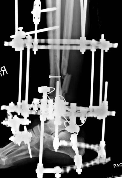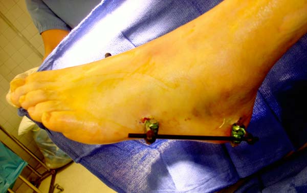 Через три дня оперирована стопа и для нейтрализации сил колонн оставили наружный фиксатор.