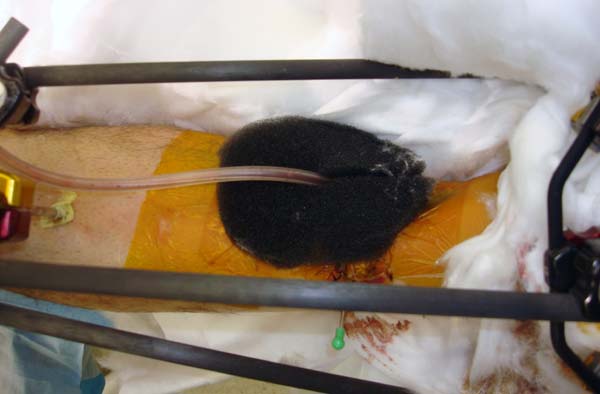 В нашем случае, травма в результате коллапса крыши. Открытый перелом. Ургентные Irrigation and Debridment, дистракция наружным фиксатором. В госпиталях первого уровня редко бывает изолированная травма, и на другой стороне повреждение стопы с переломом навикулярной кости. После обработки раны - вакуум и двухсторонние наружные фиксаторы.