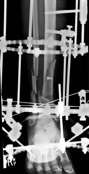 После спадения отека вариантов фиксации много, включая мининвазивную технику, но данный случай закончили установкой простого аппарата Илизарова.