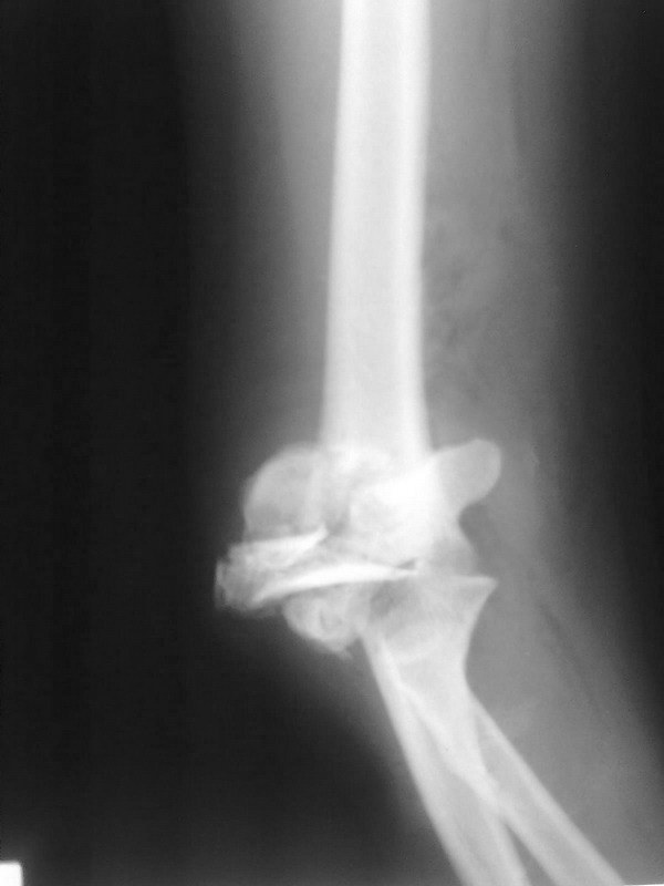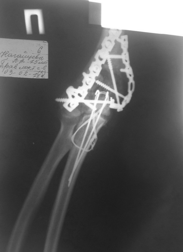 Прооперирована на 2 сутки - остеосинтез реконструктивными пластинами плеча и локтевого отростка по типу Weber. В мае 2011 - явления спицевого остеомиелита на фоне слабой консолидации . Спицы удалены. Свищи закрылись. Больная ушла на реабилитацию в поликлинику.