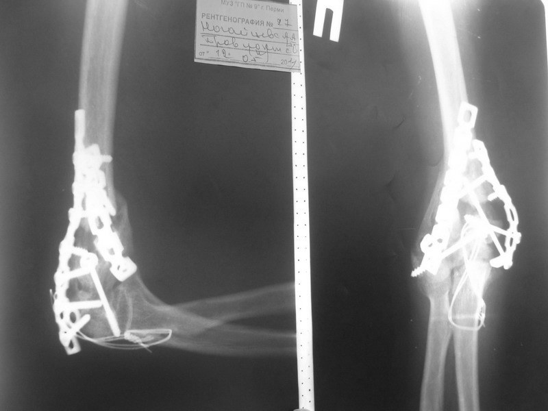 Уважаемые коллеги. Помогите советом определится с тактикой дальнейшего лечения. Пациентка, 16 лет. В 02.2011 - тяжелая сочетанная травма ОДА, груди, живота. В т.ч.открытый многооскольчатый чрезмыщелковй перелом правого плеча и локтевого отростка
