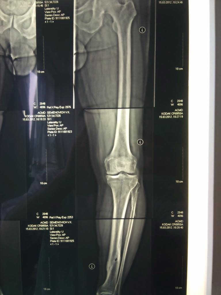 Обратился пациент, 53 года, среднего типа телосложения, довольно активного образа жизни. Жалобы - на боли в обеих коленных суставах после физических нагрузок. В анамнезе, 20 лет назад, былли переломы обеих голеней,лечился консервативно.