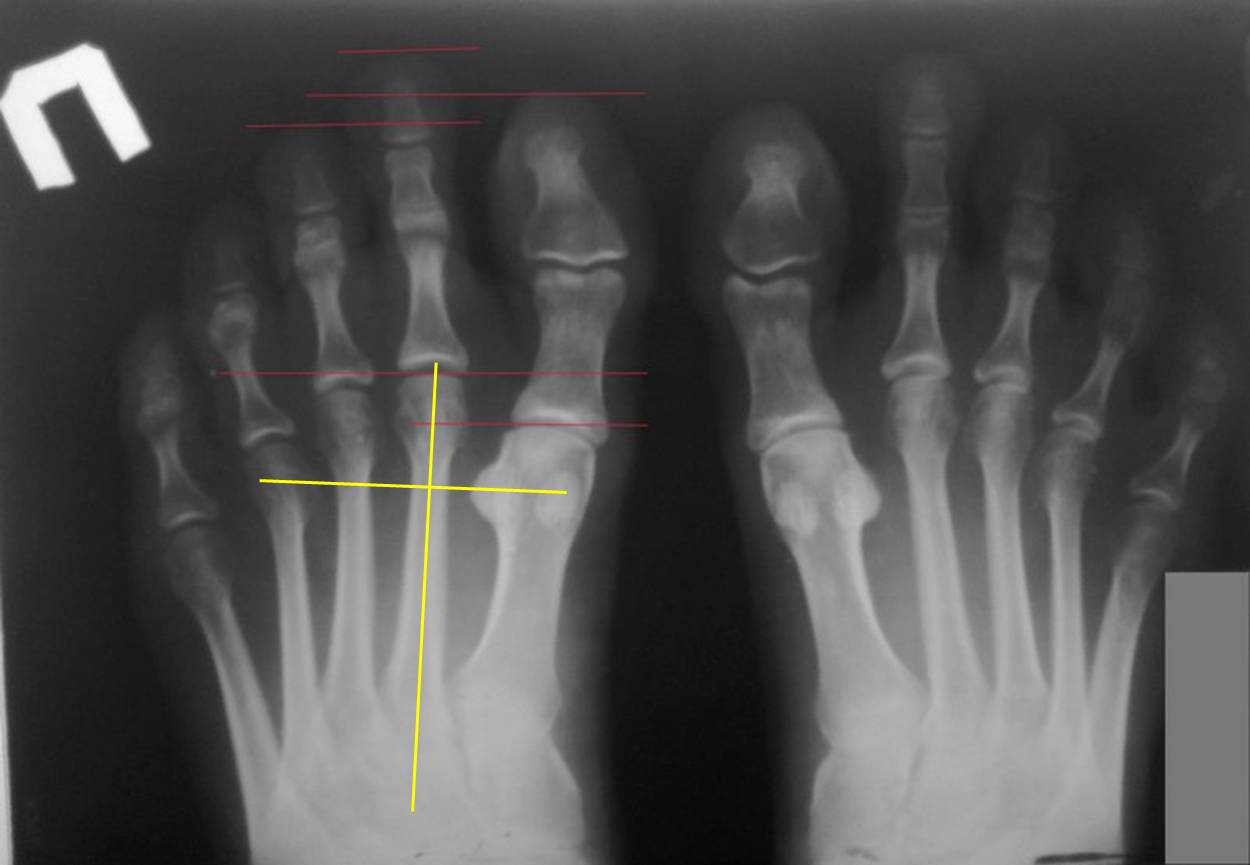 Хорошо, что пациентка отказалась от удлинения 1 плюсневой. Это привело бы к быстрому развитию hallux limitus и артроза. А почему Вы подумали, что 1 плюсневые укорочены? На представленной Вами рентгенограмме я провел перпендикуляр к оси 2 плюсневой кости на уровне середины латеральной сесамовидной. Линия прошла точно через середину головки 4 плюсневой. Это норма. То есть, длины 4 и 5 плюсневых соответствуют длине первой. А вот длины 2 и 3 плюсневых значимо преобладают над длиной первой. В такой ситуации развитие молоткообразной деформации 2 пальца вполне естественно. Есть ли у пациентки натоптыш под головкой 2 плюсневой? Пусть даже и бессимптомный. Если есть, то лучше всего совместить укорочение основной фаланги с остеотомией 2 плюсневой по Вейль. Сама по себе эта остеотомия дает укорочение до 3-5мм. И одновременно позволяет вывести из-под повышенной нагрузки головку 2 плюсневой. Вмешательство на фаланге и плюсневой кости можно делать из одного доступа.