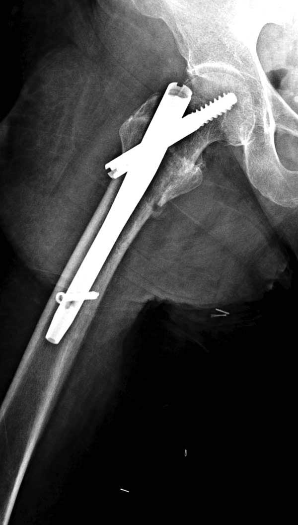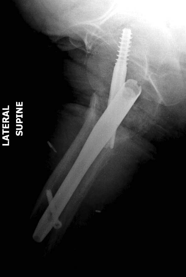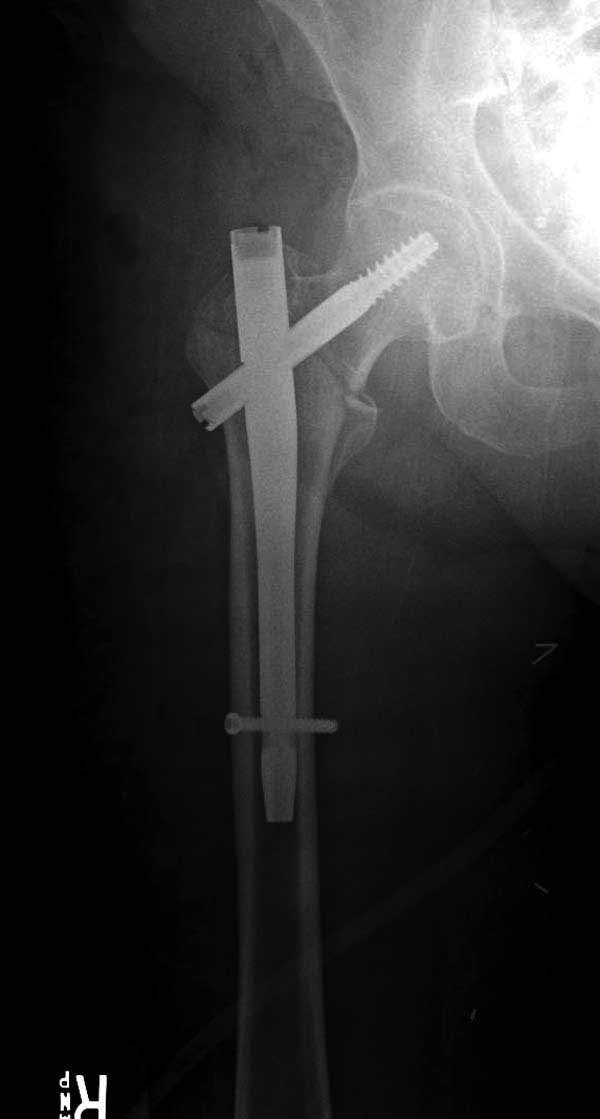 Повторно поступает после двух с половиной лет, где обнаруживается перелом на второй стороне. Немного сложно, но для фиксации выбрали Antegrade InterTan Smith Nephew Nail и с момента фиксации более 3х мес.