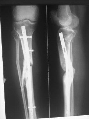Пациентка 37 лет. Лечилась оперативно по поводу оскольчатого перелома обеих костей правой