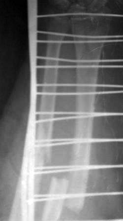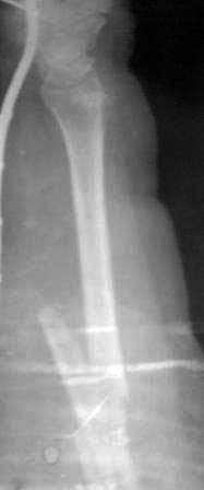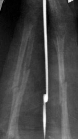 Пациентка 49 лет, по поводу перелома обеих костей предплечья оперирована в марте месяце « и/м остеосинтез спицами», через 4 месяца спицы удалены , антибиотикотерапия и фиксация гипсовой повязкой продолжена, но, учитывая что образуются ложный сустав, госпитализирована.