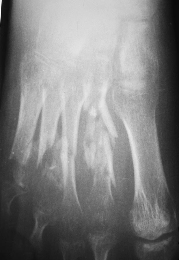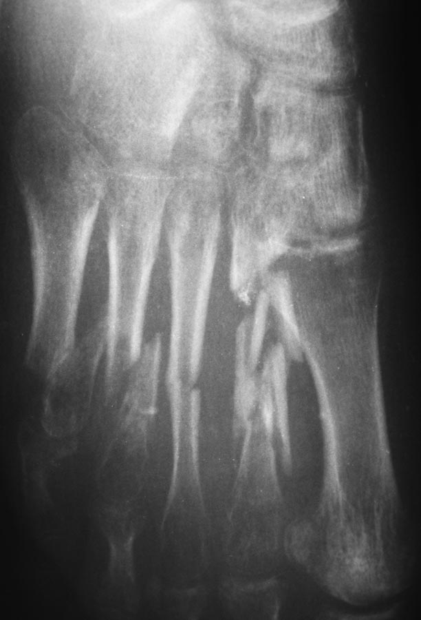 пальца правой стопы. При поступлении выполнено ПХО открытых переломов,