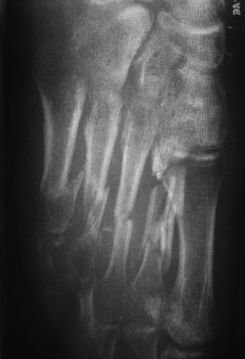 Открытые 3а степени оскольчатые переломы диафиза 2-5 плюсневых костей,