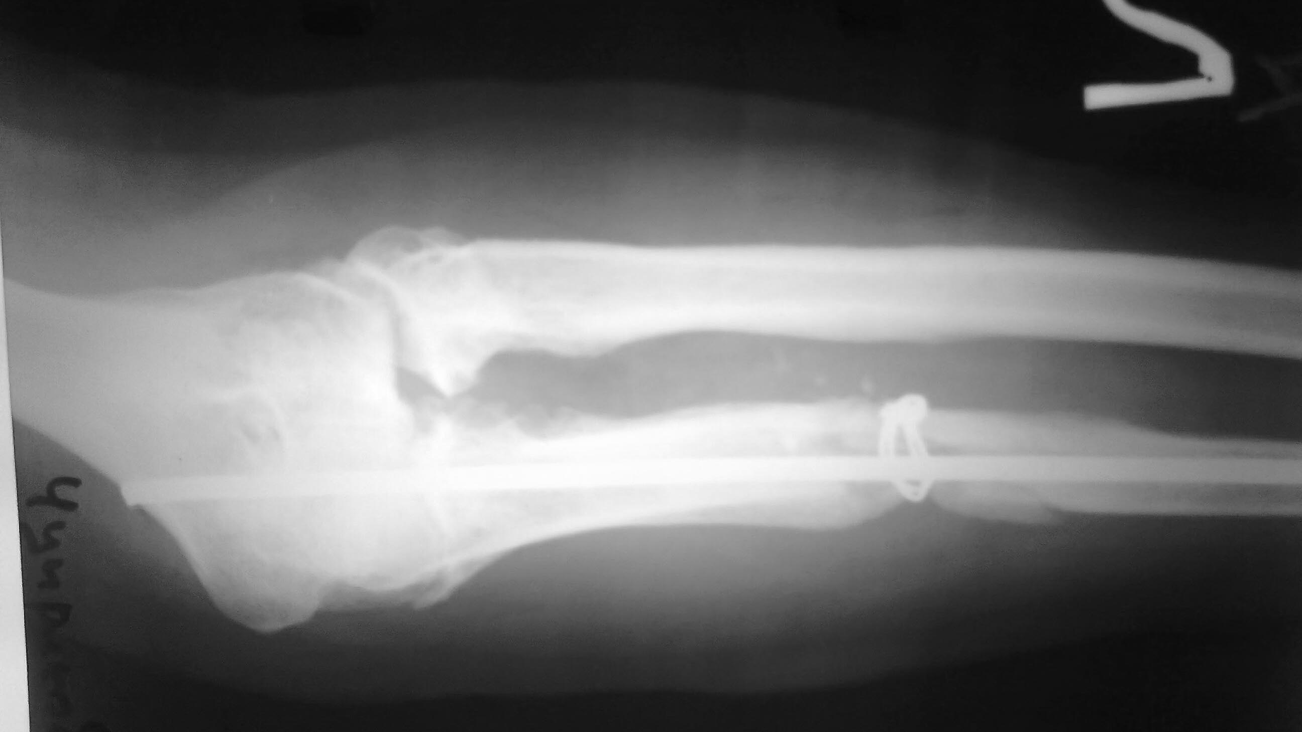 Больной оперирован 7 мес назад МОС локтевой кости гвоздем+непонятный