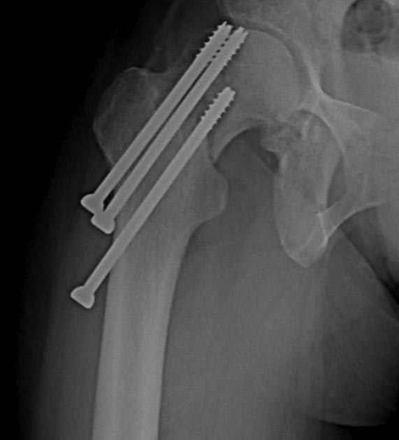 дообследовании выявлен несросшийся перелом шейки бедра на винтах.