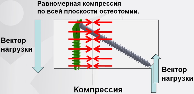 Технически данный тип остеосинтеза представляет двухвинтовую систему, в которой первый винт является позиционным, а второй – стягивающим, причем второй винт вводится через соответствующее отверстие в головке первого. Технологическим прорывом, придающем этой системе черты уникальности, является конструкция её блокирующего узла, представленного тщательно рассчитанными по своим параметрам гладкостенными конусами, плотно входящими друг в друга. Исследование параметров компрессии и стабильности остеосинтеза определили оптимальный угол, под которым винты располагаются по отношении друг к другу, он является фиксированным и составляет 60 градусов.