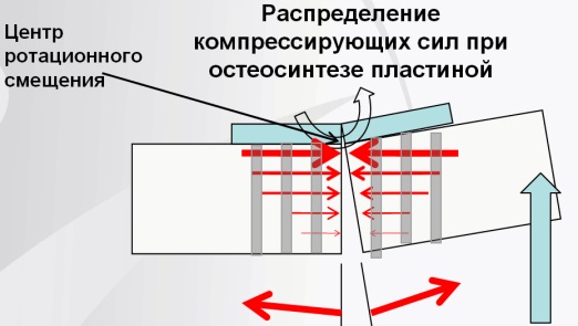 Основные силы, действующие на пластину в зоне остеотомии при нагрузке на оперированный сегмент.