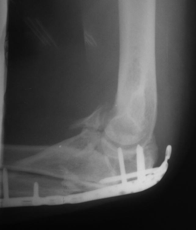 Остеотомия локтевого отростка. При ревизии сустава - винт в суставе,в