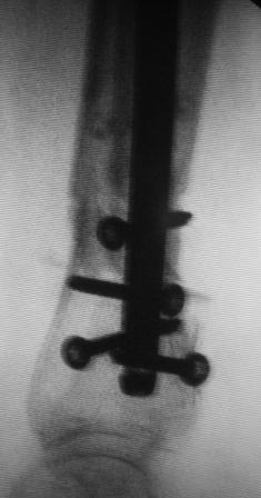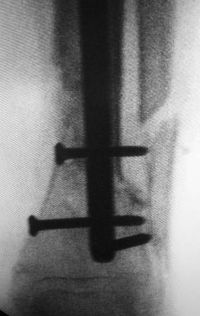 стержнем, дистально 4 винта, два из них через аутокость и оба отломка,