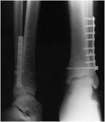 через оба кортикальных слоя большеберцовой кости.